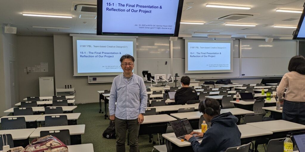 しかし、たいへん有難いことに学生はみな積極的かつ協力的で、チームワークを発揮しながらプロジェクトを楽しんでくれました。いろいろな国(アジア圏が多かったです)から来た学生たちですが、クラスのとてもフレンドリーでよい雰囲気にも助けられ、最後まで授業を進めることができました。